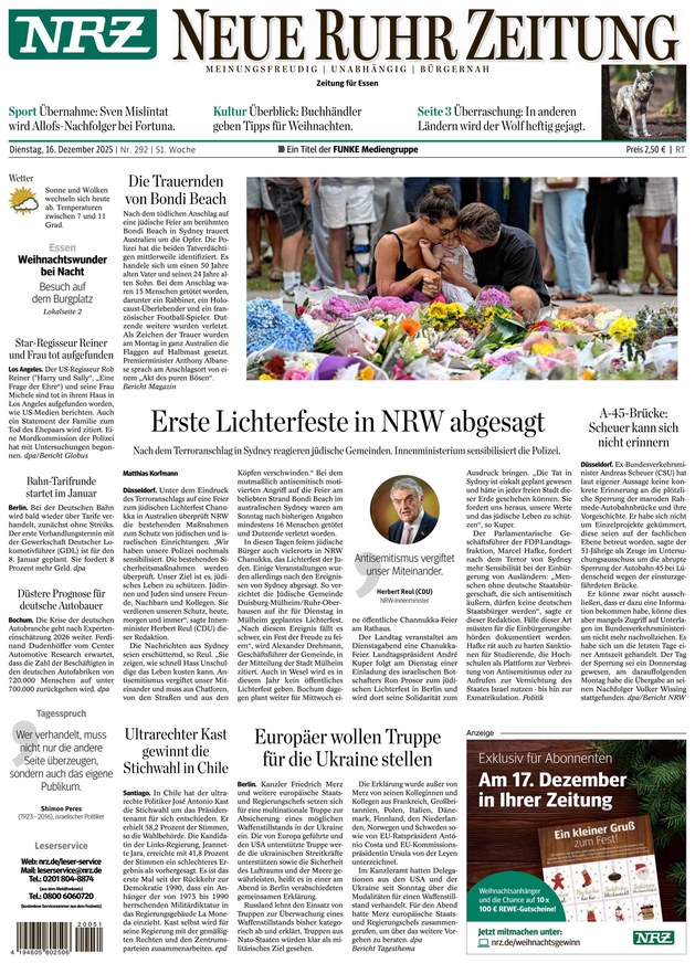Die Neue Ruhr Zeitung (NRZ) ist Ihre Tageszeitung für Essen und Umgebung. Der Schwerpunkt liegt auf der lokalen Berichterstattung, alle wichtigen News und Themen der Woche finden Sie im ePaper! Weiterlesen...