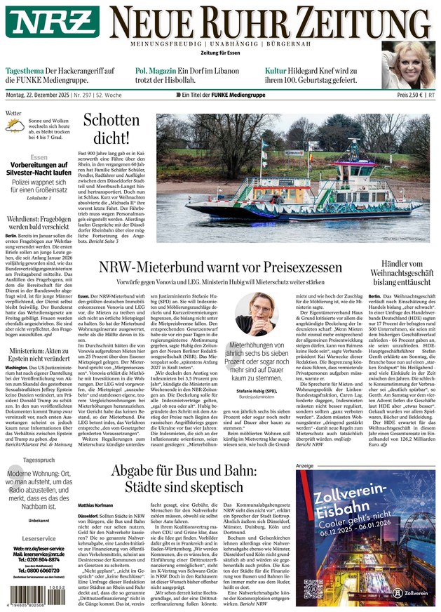 Ergänzt wird das inhaltliche Angebot durch das aktuelle Fernsehprogramm, Familienanzeigen und den Marktplatz mit Kleinanzeigen. Für Kinder gibt es eine eigene Seite, die mit dem Namen "Knuts Klartext" betitelt ist. Die erste Ausgabe der Tageszeitung, die zur Funke Mediengruppe gehört, erschien am 13. Juli 1946. Die gedruckte Ausgabe und das ePaper der NRZ sind inhaltlich und von ihrer Aufmachung her identisch - die digitale Tageszeitung liefert Ihnen die gewohnte Qualität der Print-Ausgabe.