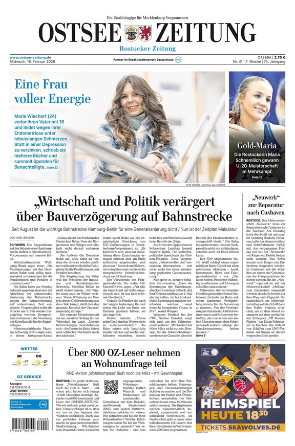 Die Ostsee-Zeitung berichtet vornehmlich als regionale Tageszeitung in Mecklenburg-Vorpommern. Sie bietet verschiedenste Ressorts wie etwa die Region Rostock oder Nachrichten aus Deutschland und aller Welt. Weiterlesen...