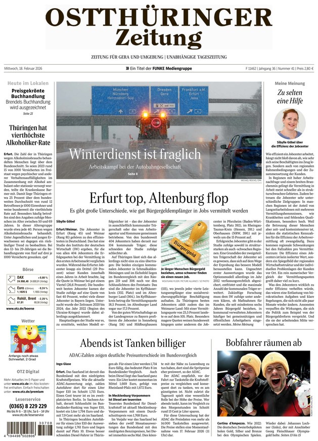 Die Ostthüringer Zeitung berichtet schwerpunktmäßig über aktuelle Geschehnisse und Nachrichten aus dem Bundesland Thüringen. Die Ostthüringer Zeitung erscheint in sieben Regionalausgaben: