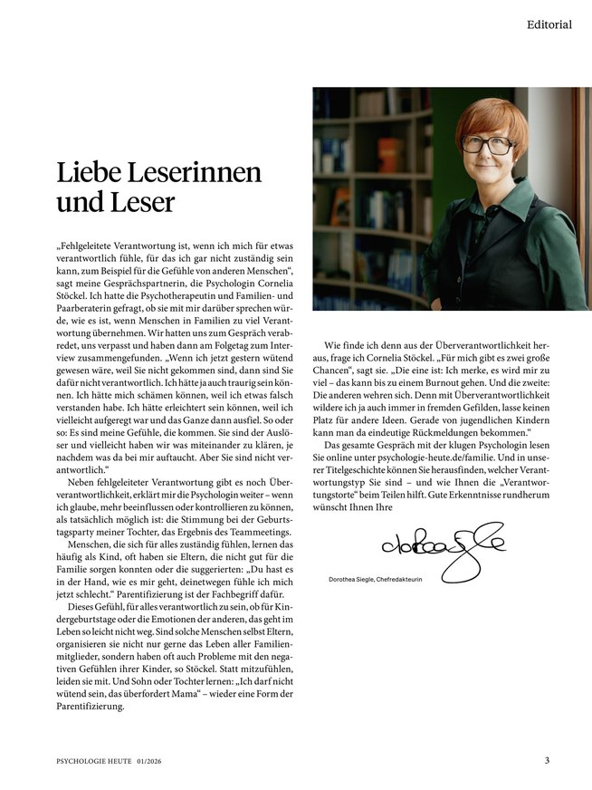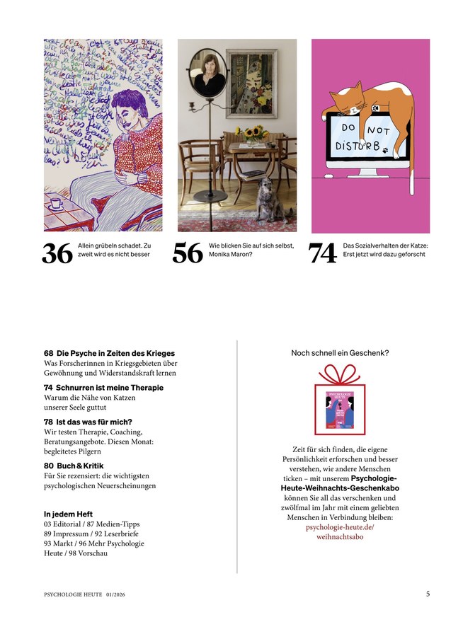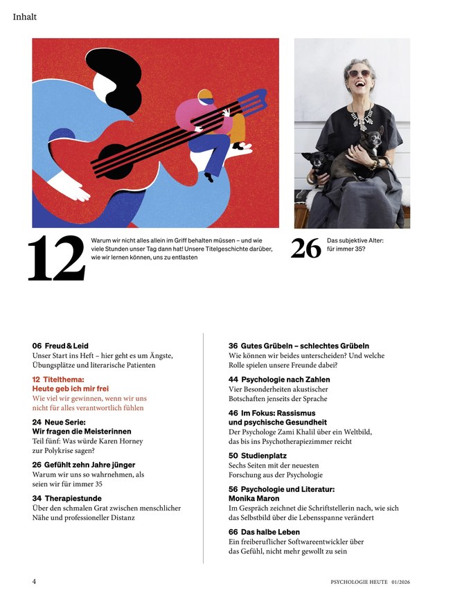 Auf über 100 Seiten informiert es die Leserinnen und Leser monatlich über spannende und alltagsrelevante Erkenntnisse und Entwicklungen aus den Bereichen Familie, Beruf, Arbeitsleben, Erziehung, Bildung, Gesellschaft und Psychotherapie. In professionell recherchierten Beiträgen, Interviews und Reportagen geht die Redaktion den wichtigen Fragen des Lebens auf den Grund: Liebe und Partnerschaft, Körper und Wohlbefinden, Persönlichkeit und Lebensweg, Kindheit und Bindung, Zufriedenheit und Selbstentfaltung.