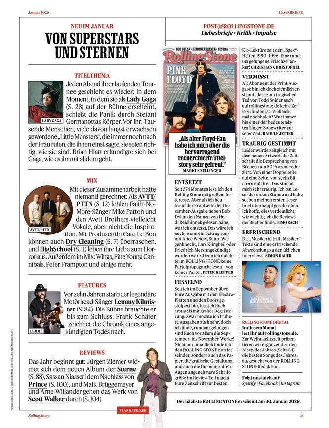 Der ROLLING STONE berichtet über alle aktuellen Highlights und Trends der Musikbranche. Lesen Sie im ePaper des Magazins spannende Storys, Reportagen und Interviews. Weiterlesen...