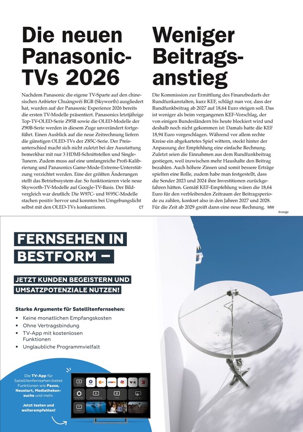 Ob UHD-Receiver, Multytenne oder HbbTV 2.0: Im ePaper von Satellit Empfang + Technik finden Sie nicht nur alles Wissenswerte zu den aktuellen Trends der Branche, sondern auch nützliche Hintergrundartikel zum Thema Empfang und Installation. Umfangreiche Testberichte stellen die neuesten Empfangsgeräte auf den Prüfstand, abgerundet wird das redaktionelle Konzept von Satellit Empfang + Technik schließlich durch praxisnahe Workshops rund um den Receiver, die Antenne, das LNB oder das CI-Modul.