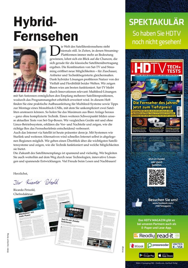 Anschaulich und leicht verständlich bereitet das Magazin Satellit Empfang + Technik seine Leser auf den Um- bzw. Einstieg ins digitale Zeitalter vor. In vier Ausgaben pro Jahr profitieren Sie mit dem ePaper von ausführlichen Testberichten und Praxistipps aus der Welt des digitalen TV-Empfangs via Satellit. Satellit Empfang + Technik ist online im iKiosk für Sie erhältlich: Lesen Sie das ePaper auf Ihrem Smartphone, Tablet, Laptop oder Computer - bei uns finden Sie sowohl Einzelhefte als auch die Möglichkeit, Satellit Empfang + Technik auf Jahresbasis zu abonnieren. Die jeweils aktuelle Ausgabe steht sofort nach Erscheinen hier im iKiosk für Sie zur Verfügung.
