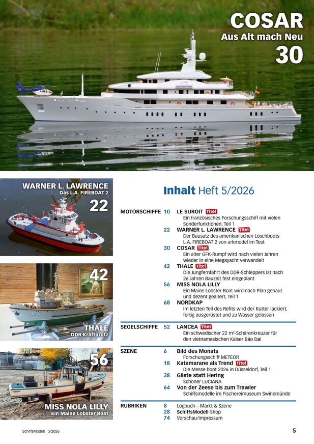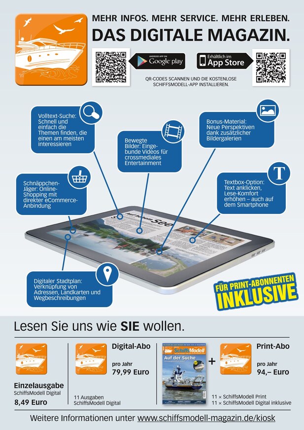 Sie haben sich ganz und gar dem Schiffsmodellbau verschrieben? Ob schnittige Yacht oder stattlicher Schlepper, ob Dampfer, Marineschiff oder pfeilschnelles U-Boot - einmal im Monat erhalten Sie mit dem ePaper von SCHIFFSMODELL den ultimativen Kompass für Ihr Hobby! Die digitale Ausgabe von SCHIFFSMODELL können Sie jetzt ganz unkompliziert auf dem Endgerät Ihrer Wahl lesen - im iKiosk steht die jeweils neueste Ausgabe bereits am Erscheinungstag online für Sie bereit.