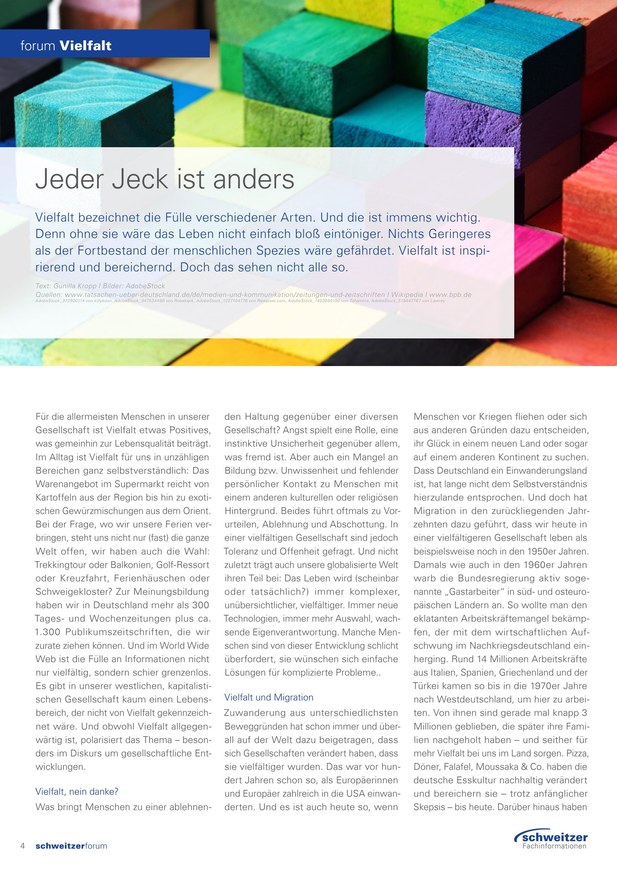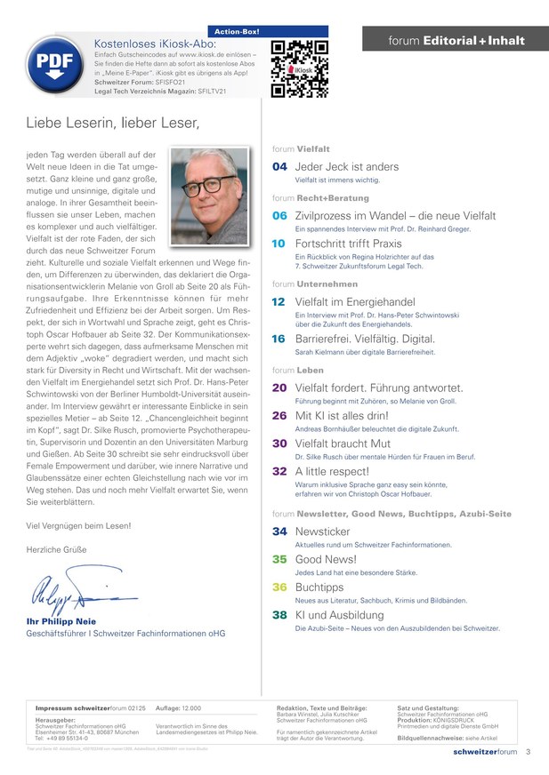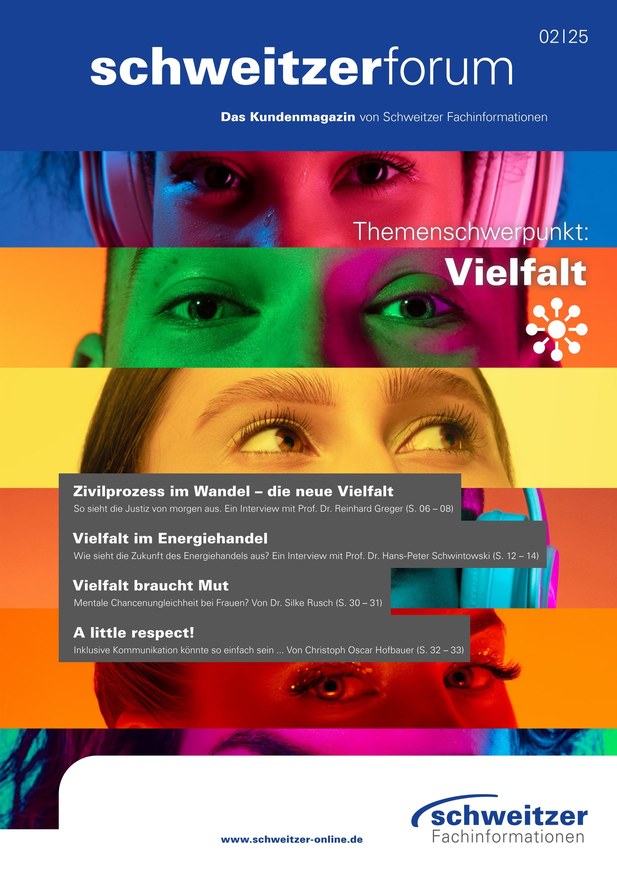 Das Schweitzer Forum ist das Kundenmagazin von Schweitzer Fachinformationen. Es erscheint 2x im Jahr und ist für Sie kostenlos. Die Print-Ausgabe erhalten Sie in den Buchhandlungen von Schweitzer in ganz Deutschland.