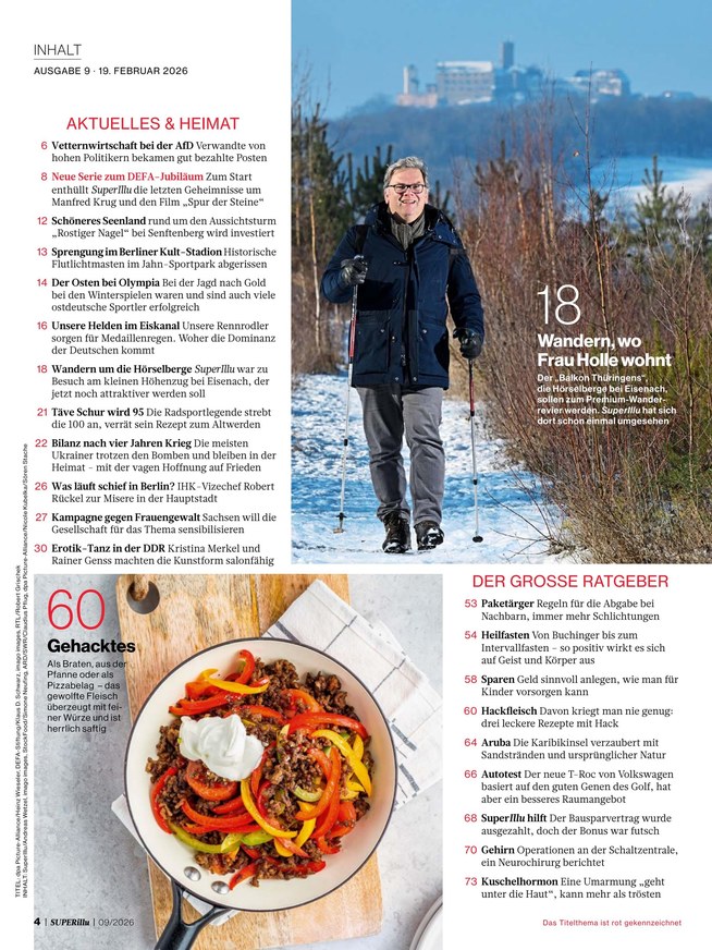 Die SUPERillu ist die Wochenzeitschrift für den Osten und liefert in jeder Ausgabe spannende News rund um Land und Leute, heimische Stars oder derzeit brisante Themen. Weiterlesen...
