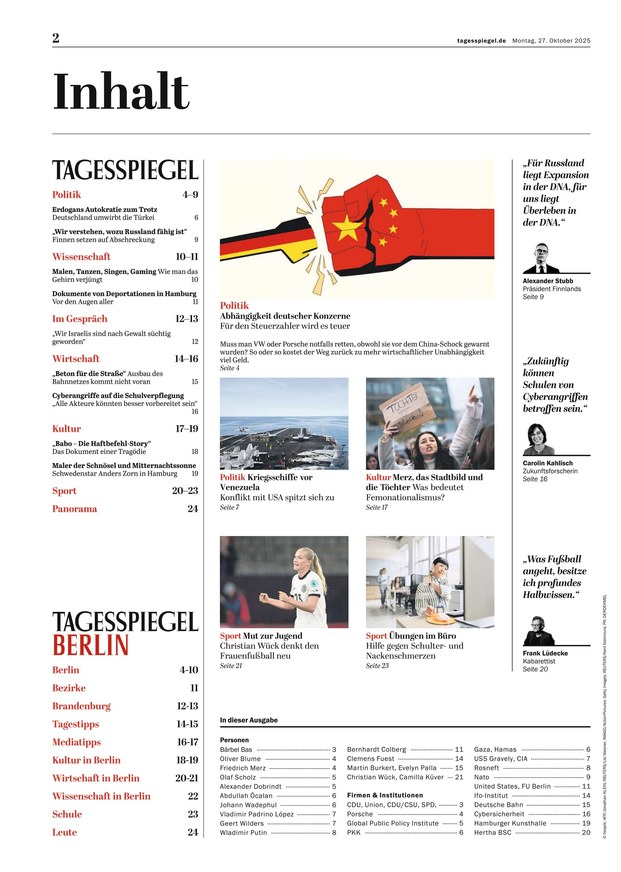 Mit der Rubrik „Fragen des Tages“ werden Lesende über aktuelle Fakten informiert, es folgt klassisch die Seite Drei, auf der sich die Redaktion ausführlich mit verschiedenen Themenbereichen auseinandersetzt. Von Lifestyle über Geographie bis Politik ist alles dabei. Dank dieser Vielfalt bietet der Tagesspiegel eine Quelle für Neugierige aller Lebensbereiche.