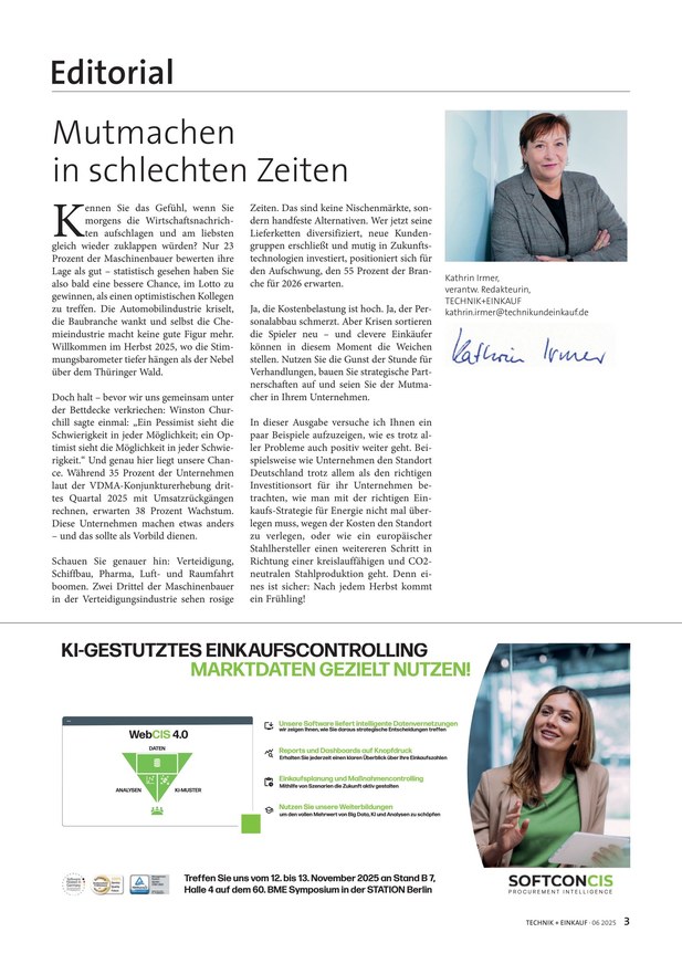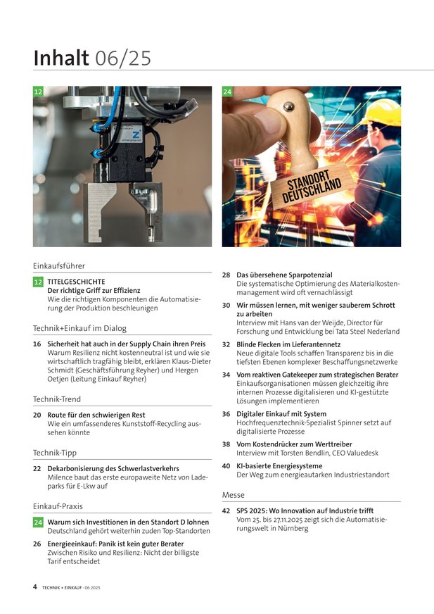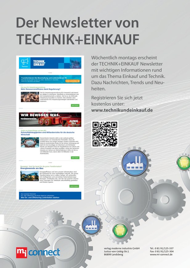 TECHNIK+EINKAUF ist der abteilungsübergreifende Team-Titel für die Entscheider aus technischem und strategischem Einkauf, Konstruktion und Produktion. Die Fachzeitschrift für die verarbeitende Industrie beschäftigt sich ganzheitlich mit dem Beschaffungsprozess und verschafft der Technik zu diesem Zweck mehr Einkaufskompetenz, dem Einkauf mehr Technik-Wissen und dem ganzen Entscheider-Team mehr Effizienz.