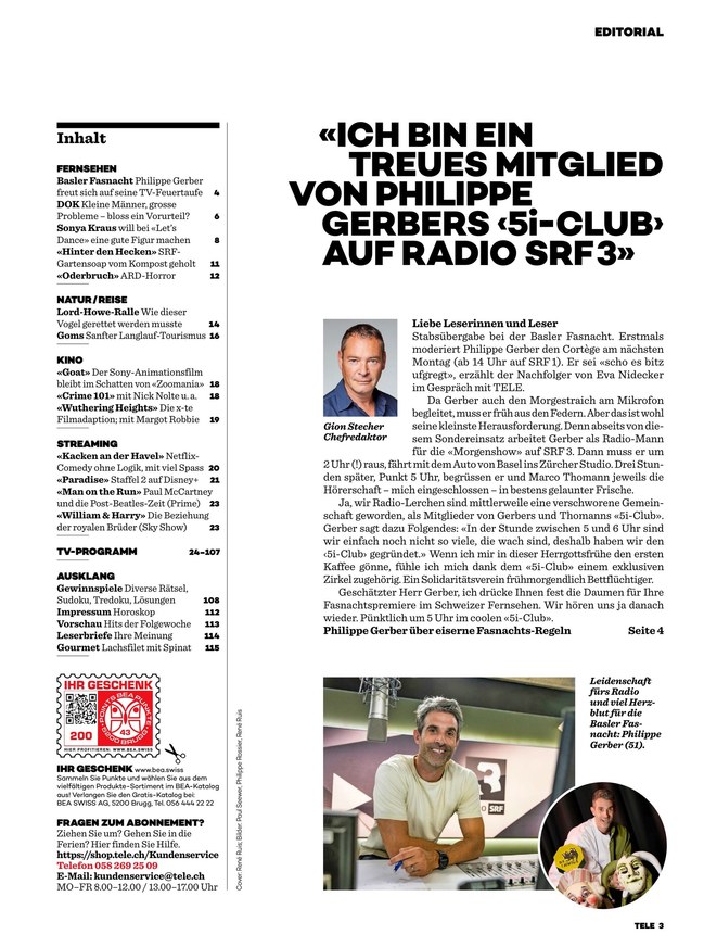 Das Magazin TELE trägt den Untertitel "Das TV-Magazin der Schweiz". Der Schwerpunkt liegt somit auf allen Sendern, die Sie in der Schweiz empfangen können. Der Aufbau des ePapers zeichnet sich durch Übersichtlichkeit und klare Strukturen aus. In den "TELE Highlights" beispielsweise finden Sie die TV-Hits der Woche auf einen Blick. Berücksichtigt werden dabei folgende Kategorien: Spielfilme, Serien/ Unterhaltung, Info/ Natur/ Kultur/ Sport/ Kinder. Zudem gibt es täglich eine Doppelseite mit den Filmen des Tages, weiteren Tipps und allen Spielfilme des Tages - mit Sternebewertung. In der Vorschau erhalten Sie einen Ausblick auf die TV-Hits der folgenden Programmwoche.