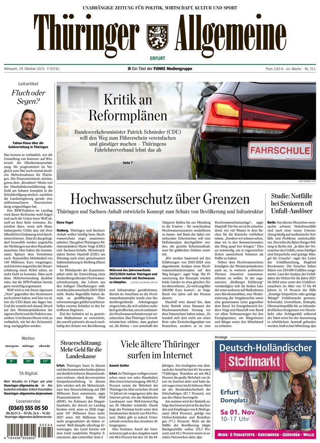 Die Thüringer Allgemeine berichtet schwerpunktmäßig über aktuelle Geschehnisse und Nachrichten aus dem Bundesland Thüringen. Die Thüringer Allgemeine erscheint in zehn Regionalausgaben:
