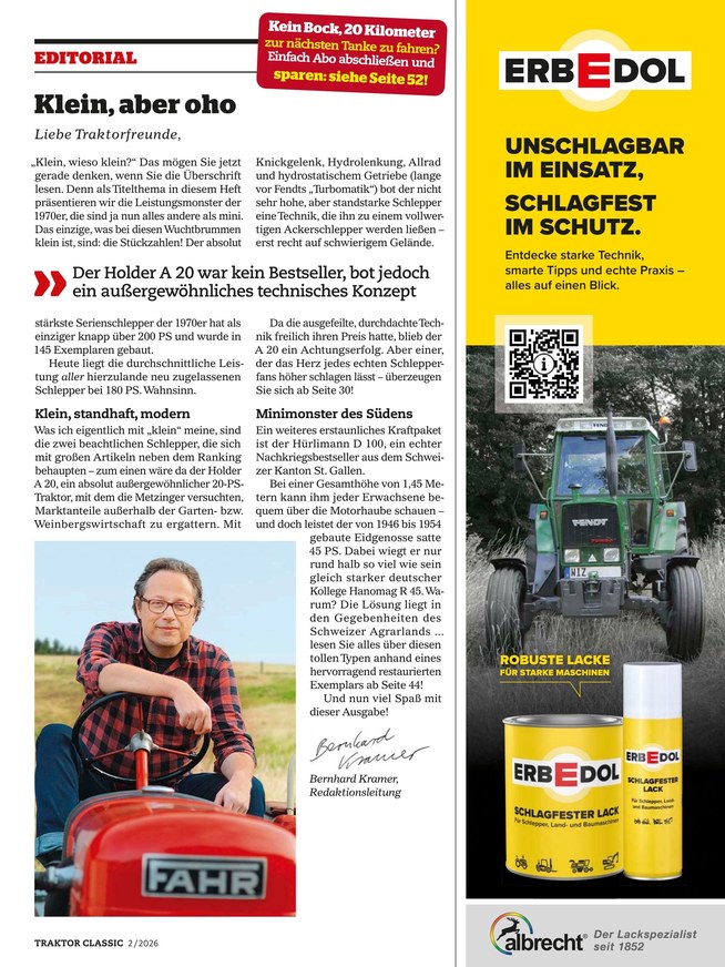 TRAKTOR CLASSIC bietet in jeder Magazinausgabe eine Auswahl fester Rubriken. Angefangen bei dem Editorial folgen weitere Rubriken wie: