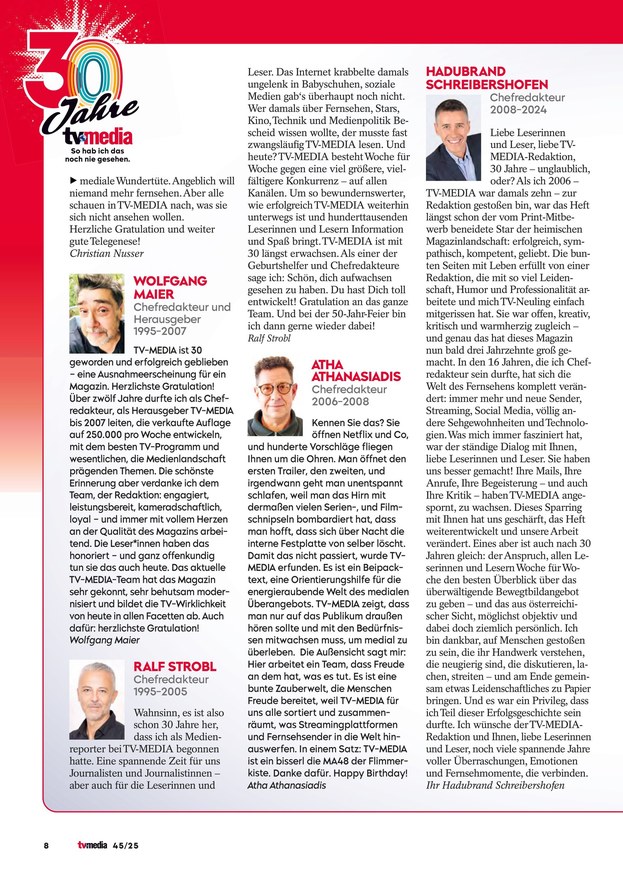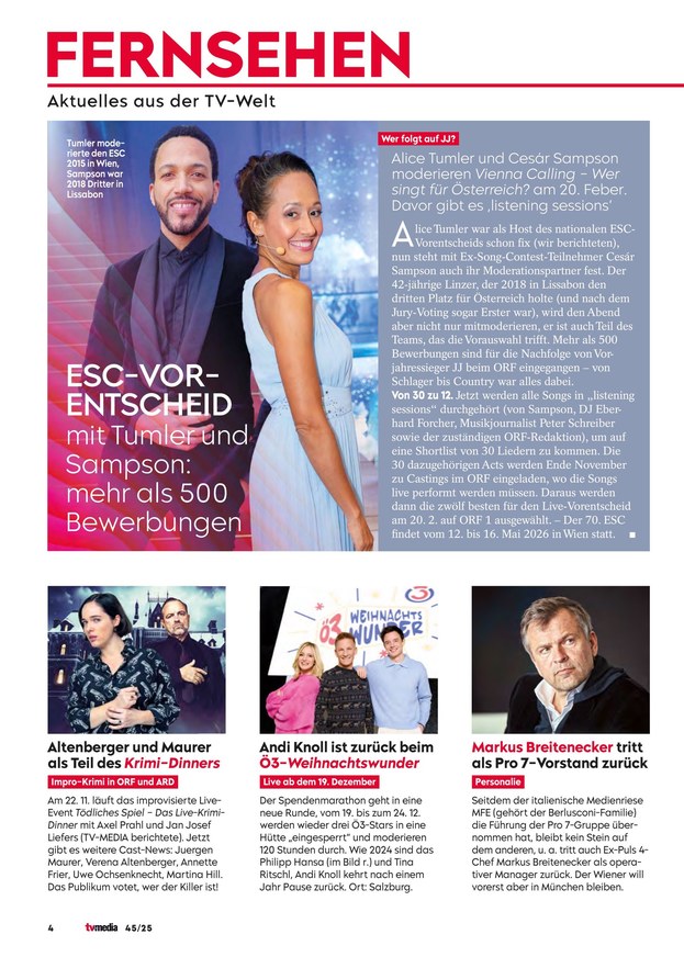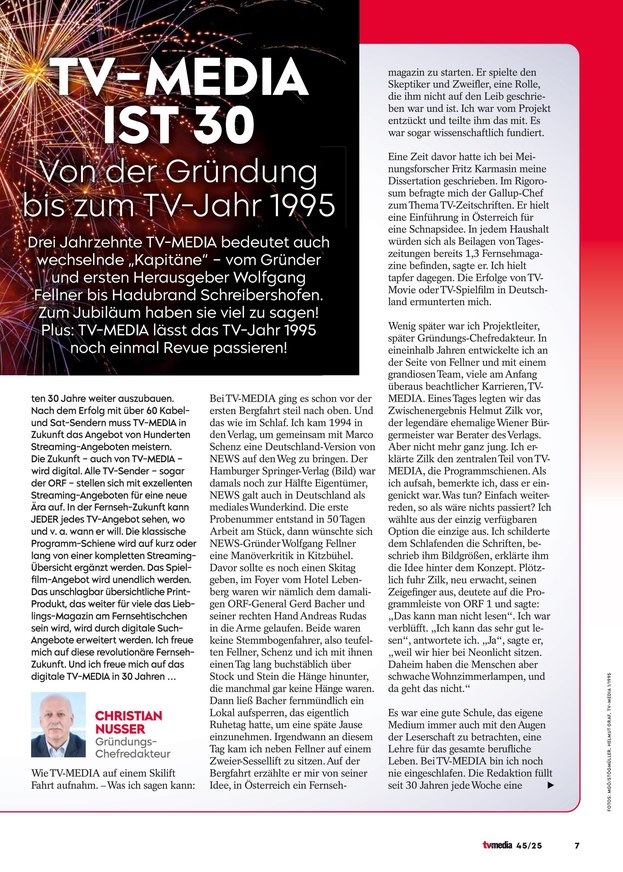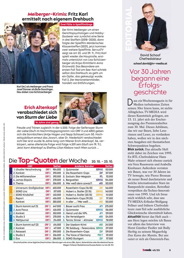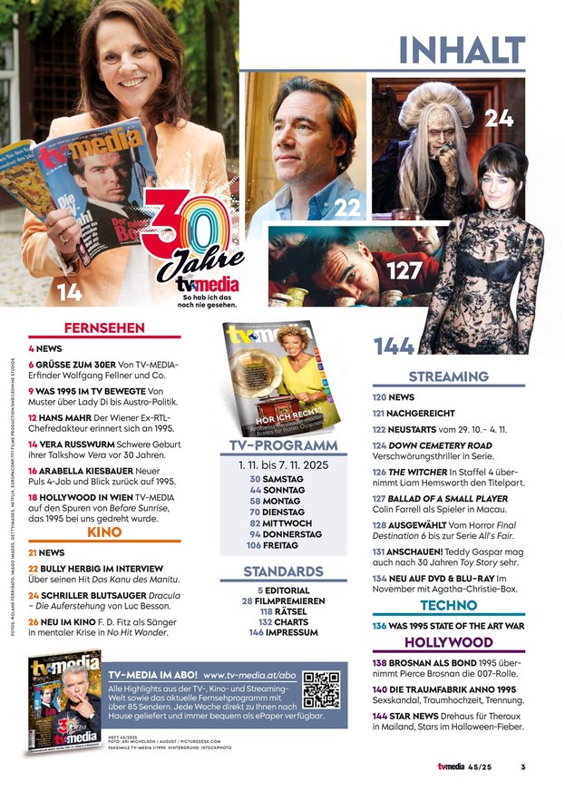 "Einfach fernsehen" lautet das Motto von TV-MEDIA und diesem Motto wird das ePaper der Fernsehzeitschrift mehr als gerecht: Übersichtlich wird das TV-Programm der Woche dargestellt, neben den österreichischen Fernsehsendern umfasst das ePaper auch sämtliche deutschen Kanäle. Finden Sie sofort die besten Programmtipps auf einen Blick, ohne lange zu suchen. Außerdem enthält TV-MEDIA das aktuelle Kinoprogramm, sowie Top-Storys aus den Bereichen Film, Serie, Kino und Stars. News, (Technik-)Trends & Kultiges werden genauso präsentiert wie der neueste Klatsch und Tratsch aus Hollywood. Freuen Sie sich auf die Vorstellung neuer Sendeformate, Ausblicke auf neue Filme und brandheiße Tipps in Sachen Streaming. Infos zu Einschaltquoten, Kolumnen, Interviews, Gewinnspiele und Kritiken runden das inhaltliche Angebot ab. Folgende Rubriken gibt es in jeder Ausgabe von TV-MEDIA: