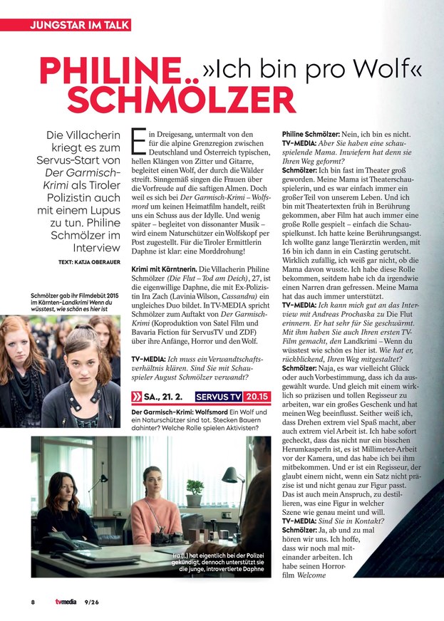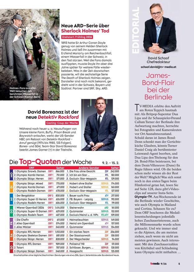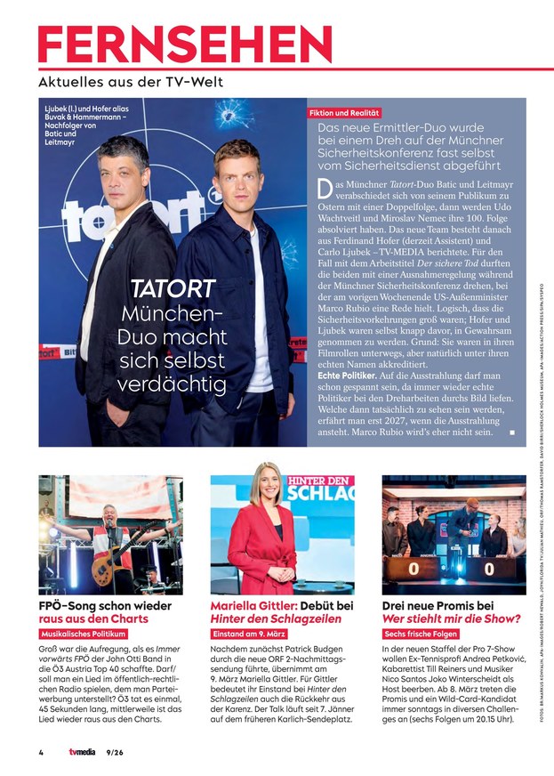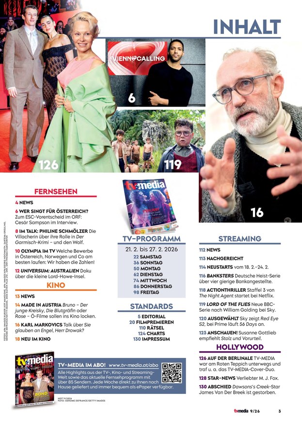 "Einfach fernsehen" lautet das Motto von TV-MEDIA und diesem Motto wird das ePaper der Fernsehzeitschrift mehr als gerecht: Übersichtlich wird das TV-Programm der Woche dargestellt, neben den österreichischen Fernsehsendern umfasst das ePaper auch sämtliche deutschen Kanäle. Finden Sie sofort die besten Programmtipps auf einen Blick, ohne lange zu suchen. Außerdem enthält TV-MEDIA das aktuelle Kinoprogramm, sowie Top-Storys aus den Bereichen Film, Serie, Kino und Stars. News, (Technik-)Trends & Kultiges werden genauso präsentiert wie der neueste Klatsch und Tratsch aus Hollywood. Freuen Sie sich auf die Vorstellung neuer Sendeformate, Ausblicke auf neue Filme und brandheiße Tipps in Sachen Streaming. Infos zu Einschaltquoten, Kolumnen, Interviews, Gewinnspiele und Kritiken runden das inhaltliche Angebot ab. Folgende Rubriken gibt es in jeder Ausgabe von TV-MEDIA: