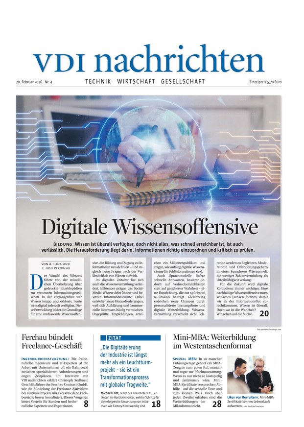 Jede Woche schreibt die Redaktion von VDI nachrichten die Entwicklungen zu Technik, Wirtschaft und Gesellschaft nieder und inspiriert so Ihren Arbeitsalltag. Sie möchten die informativen Seiten von VDI nachrichten immer mit dabeihaben? Mit dem iKiosk können Sie die Zeitschrift als ePaper ganz gemütlich in der Bahn oder vor dem Nachmittagsmeeting lesen. Der iKiosk bietet Zoom und Volltextsuche als zusätzliche Funktionen, die bequemes Lesen auf Smartphone, Tablet und Computer unterwegs und zuhause ermöglichen.