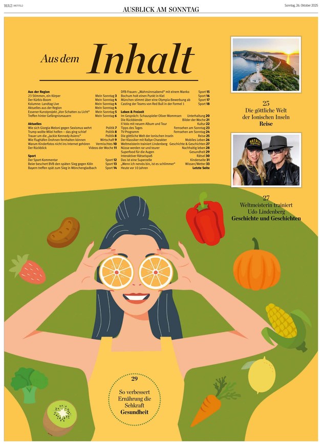 Mit mehr als 300 Redakteuren und Fotografen, 31 Lokalredaktionen und 28 Lokalausgaben im Ruhrgebiet ist die Westdeutsche Allgemeine Zeitung (WAZ) die größte Regionalzeitung Deutschlands. Berichtet wird unabhängig, überparteilich und besonders nah am Leser: Dadurch, dass es für jede Redaktion der WAZ einen Leserbeirat gibt, werden die Wünsche und Anregungen der Leser stets berücksichtigt und spiegeln sich in der Gestaltung und Themenauswahl der Tages- und Sonntagszeitung wider. Geschrieben wird über Themen, die die Leser besonders interessieren und betreffen. Alles, was in Nordrhein-Westfalen und darüber hinaus wichtig ist, erfahren Sie Tag für Tag in der WAZ. Die Sonntagszeitung geht darüber sogar noch einen Schritt hinaus: Neben allen relevanten News der Woche aus den Ressorts Nordrhein-Westfalen, Politik, Vermischtes und Sport finden Sie in der WAZ am SONNTAG im Ressort Leben & Freizeit folgende Rubriken: