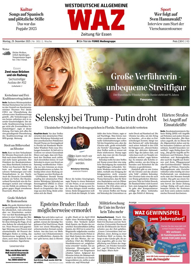 Die Westdeutsche Allgemeine Zeitung (WAZ) liefert brandaktuelle Nachrichten aus den Bereichen Politik, Wirtschaft, Kultur und Sport. Im ePaper finden Sie zudem regionale News aus Nordrhein-Westfalen. Weiterlesen...