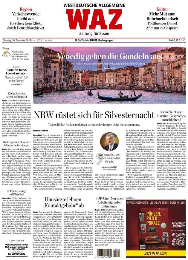 Die Westdeutsche Allgemeine Zeitung (WAZ) liefert brandaktuelle Nachrichten aus den Bereichen Politik, Wirtschaft, Kultur und Sport. Im ePaper finden Sie zudem regionale News aus Nordrhein-Westfalen. Weiterlesen...