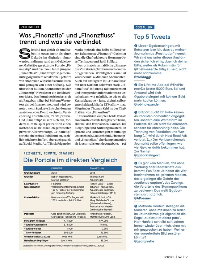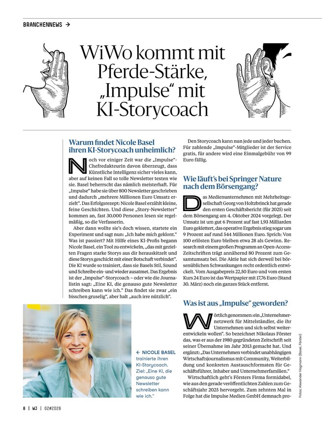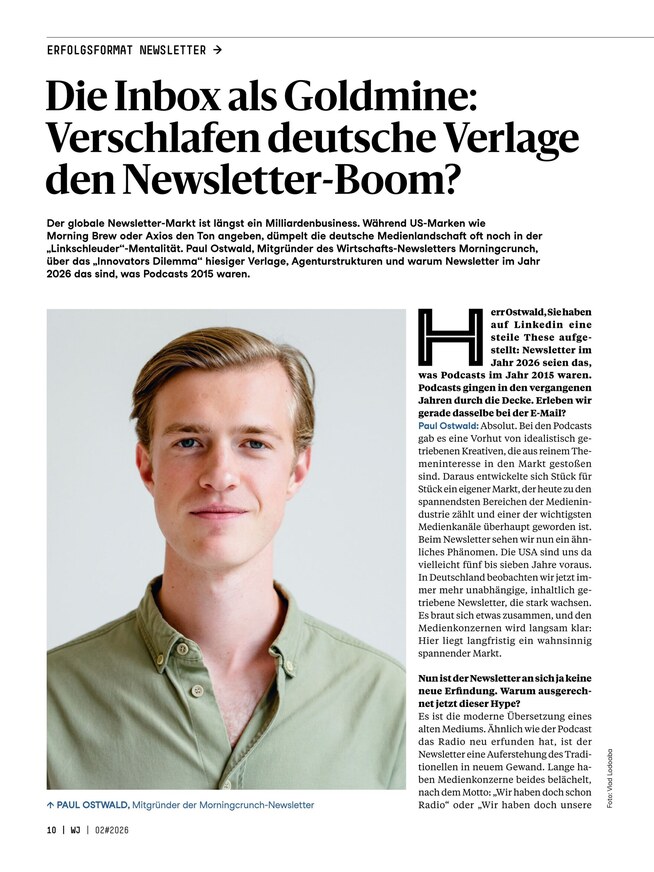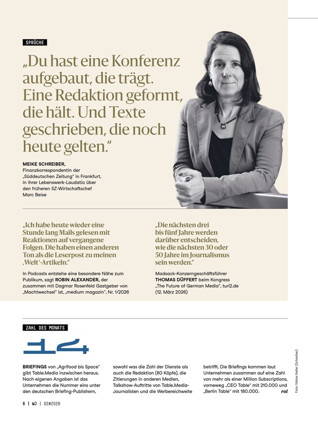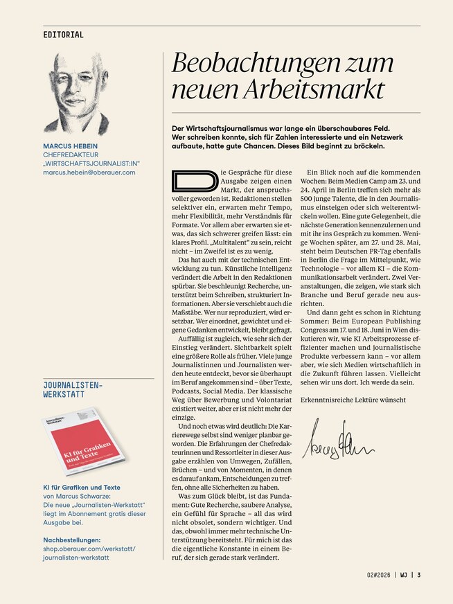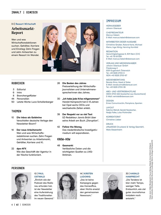 Wirtschaftsjournalismus ist alles andere als trocken - ganz im Gegenteil: Aufregende Hintergrundberichte, lebendige Reportagen und kritische Köpfe zeichnen die Branche aus, die stets in Bewegung ist. Lesen Sie das Magazin Wirtschaftsjournalist, um über alle Neuerungen informiert zu bleiben und interessante Insights zu erhalten. Das ePaper können Sie unkompliziert am Smartphone, Tablet oder Computer lesen, alle zwei Monate erscheint eine neue Ausgabe.