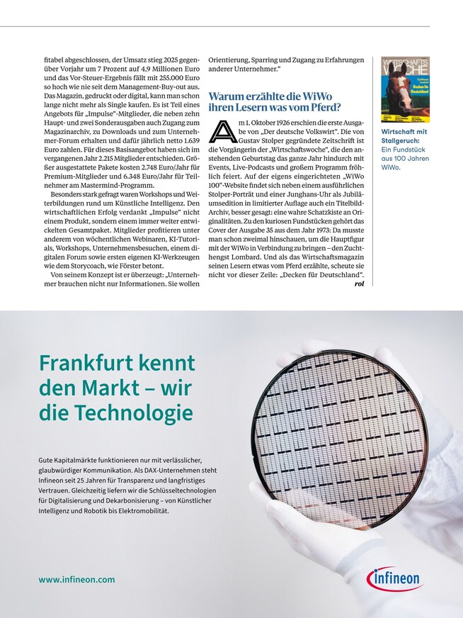 Lesen Sie Wirtschaftsjournalist als ePaper im iKiosk! Die vollständigen Inhalte des gedruckten Magazins finden Sie in identischer Form in der digitalen Variante, können jedoch beim Lesen des ePapers auf praktische Funktionen zurückgreifen: Stellen Sie Text und Bilder mit Hilfe des Zooms vergrößert dar, finden Sie über die Suchfunktion alle Themen, die Sie gezielt interessieren und setzen Sie Lesezeichen. Im iKiosk-Archiv können Sie zu Recherchezwecken zudem auf ältere Ausgaben des Wirtschaftsjournalist-ePapers zugreifen.