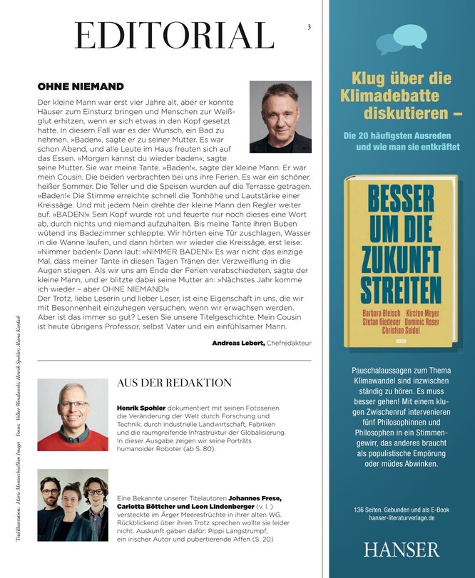 Das Magazin ZEIT WISSEN berichtet über Themen aus den Bereichen Gesundheit, Psychologie, Forschung, Technik, Umwelt und Gesellschaft. Das ePaper des Wissensmagazins setzt Ansätze, die zum Nachdenken anregen. Weiterlesen...