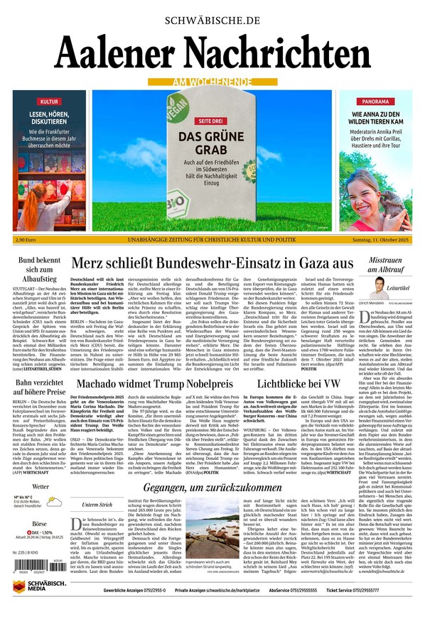 Als Lokalausgabe der Schwäbischen Zeitung erscheinen die Aalener Nachrichten von Montag bis Samstag mit einem überregionalen Teil, der in Ravensburg produziert wird, und die Lokalnachrichten optimal ergänzt. Das ePaper enthält aktuelle Ortsnachrichten und Polizeimeldungen aus Aalen und der gesamten Umgebung. In Dewangen, Ebnat, Fachsenfeld, Hofen, Unterkochen, Unterrombach/ Hofherrnweiler, Waldhausen oder Wasseralfingen ist etwas passiert? In den Aalener Nachrichten erfahren Sie als erstes davon!