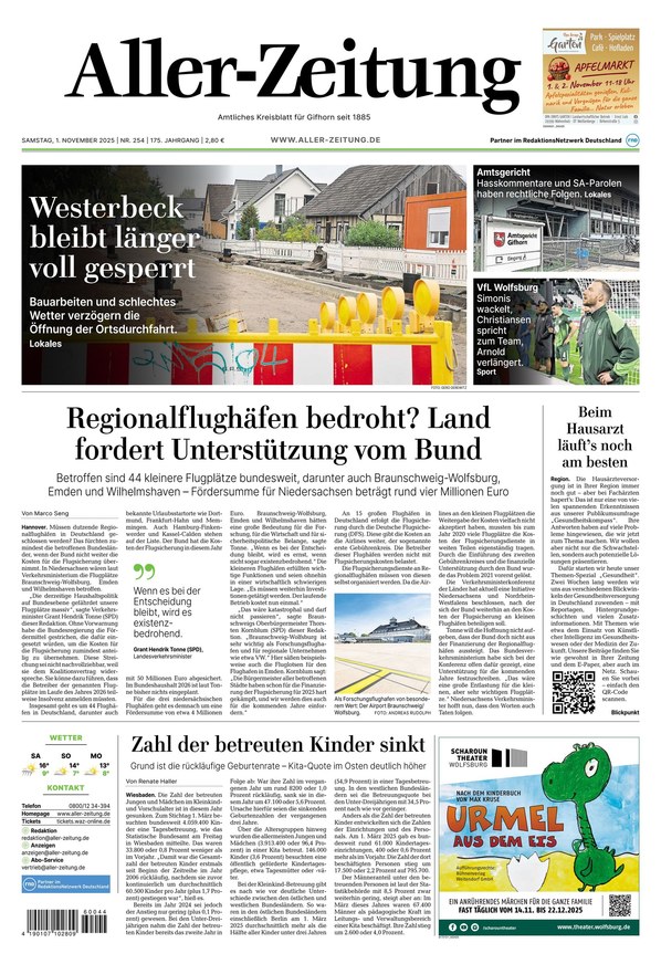Die Aller-Zeitung berichtet von Montag bis Sonntag über alles, was im Landkreis Gifhorn und darüber hinaus wichtig ist. Nachrichten aus Gifhorn, Brome, Meinersen, Isenbüttel, Papenteich, Wesendorf, Sassenburg und dem Boldecker Land sorgen dafür, dass Sie über alle wichtigen Themen auf dem Laufenden bleiben. Besonders praktisch: Das ePaper der Tageszeitung ist online lesbar und als PDF downloadbar.