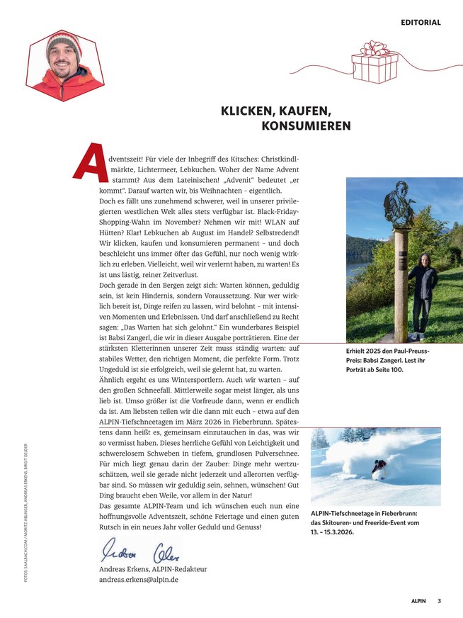 Entdecken Sie spannende neue Kletter- und Wandertouren, erhalten Sie Einblicke in das Denken und Wirken bekannter Größen der Szene oder profitieren Sie von den nützlichen Tipps und Ratgebern, die Alpin monatlich für Sie bereitstellt. Hier im iKiosk finden Sie die neueste Ausgabe der Alpin als praktisches ePaper, welches Sie bequem auf Ihrem Smartphone, Tablet oder Computer lesen können. Oder möchten Sie lieber in einer älteren Ausgabe stöbern? Dann statten Sie einfach unserem Archiv einen Besuch ab!