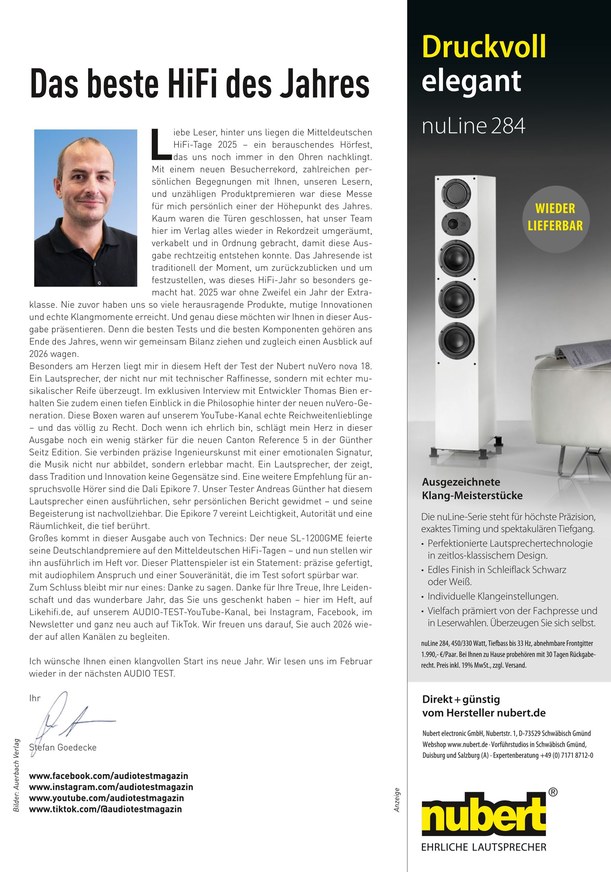 Von HiFi bis High End, von Stereo bis Surround, von analog bis digital: Im ePaper des Magazins Audio Test erfahren Sie alles Wissenswerte rund um die besten Geräte für jedes Qualitätslevel und jeden Geldbeutel. Weiterlesen...