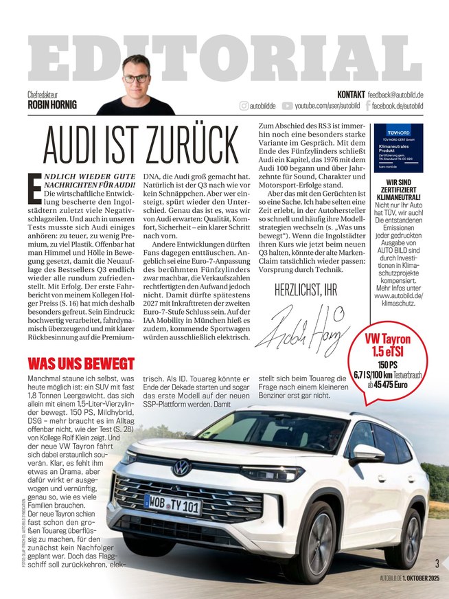 AUTO BILD unterstützt den Wandel hin zur klimaneutralen Industrie: seit 2022 ist AUTO BILD Deutschlands erstes Automotive-Magazin, das klimaneutral erscheint. Dazu werden alle CO2-Emissionen, die bei AUTO BILD in Druck, Vertrieb, Redaktion und Verwaltung anfallen, genau erfasst, analysiert und laufend optimiert. Verbleibende unvermeidbare Emissionen werden durch zertifizierte Projekte (ausschließlich Gold Standard) ausgeglichen.
