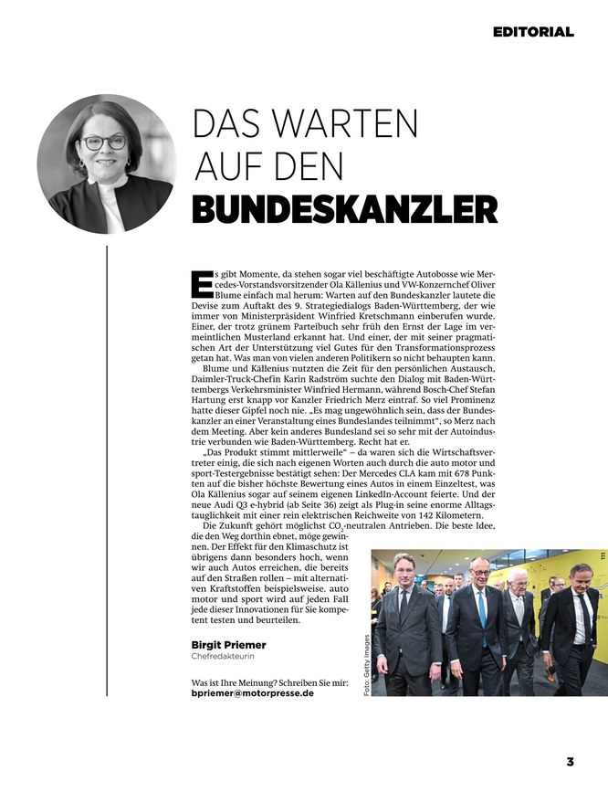 Mit AUTO MOTOR UND SPORT bekommen Sie alle zwei Wochen einen neuen Einblick in die aktuellen Autos der Gegenwart und Zukunft. Begeisterte Autofahrer schließen die Tür hinter sich und sie sind in einer anderen Welt. Mit detaillierten und ausgiebigen Tests können Lesende einen großen Überblick erhalten über den technischen Wandel und neue Impressionen bekommen.