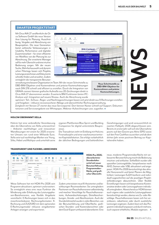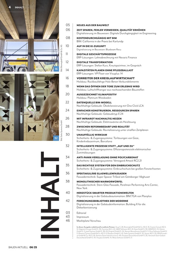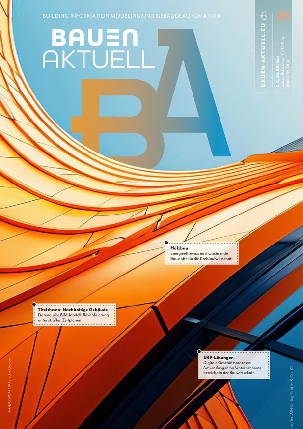 Informationen zu diesem Titel Bauen Aktuell, als plattformunabhängiges Fachmagazin, informiert vier Mal im Jahr Architekten, Bauingenieure, Tragwerksplaner, Bauplaner, Energieplaner und Baufachleute über die wichtigsten Innovationen in den Segmenten Architektur, BIM, Bau-IT, Haustechnik & TGA, AVA, Energieplanung, Facility Management, Projektmanagement und -controlling, mobile Kommunikation, Energie- und Gebäudetechnik sowie Gebäudeautomation.