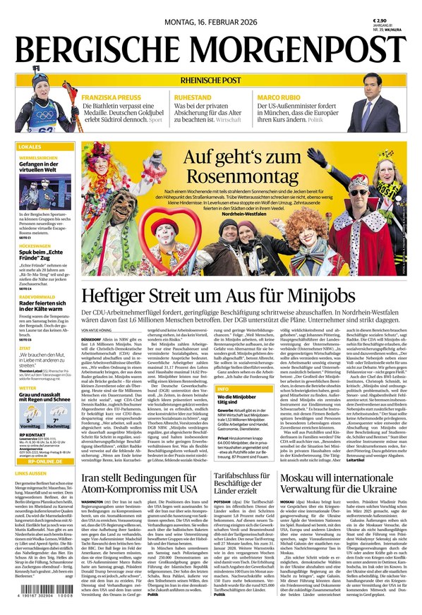 Die Bergische Morgenpost ist eine lokale Ausgabe der Tageszeitung Rheinische Post für das Bergische Land. Im ePaper finden Sie alle relevanten Nachrichten aus der Region, Deutschland und der Welt. Weiterlesen...