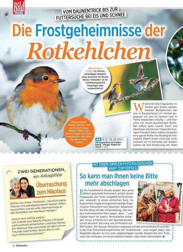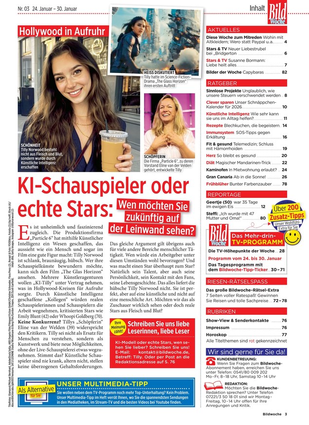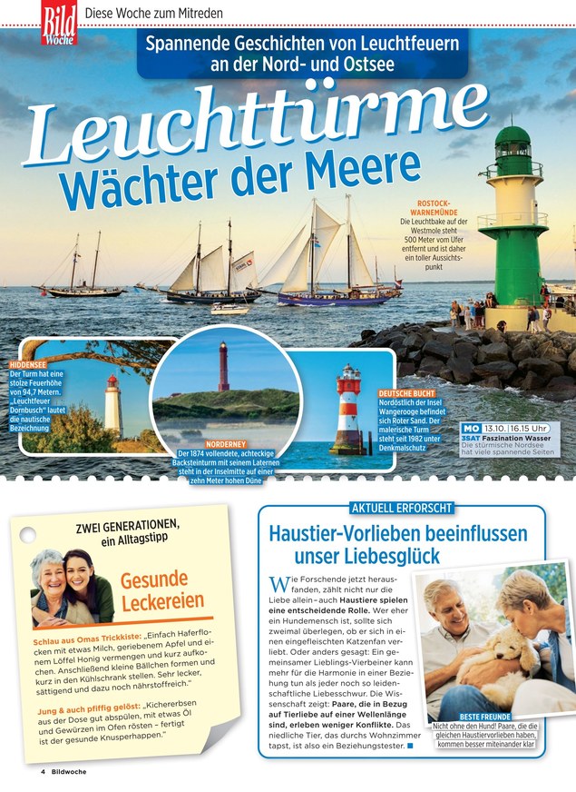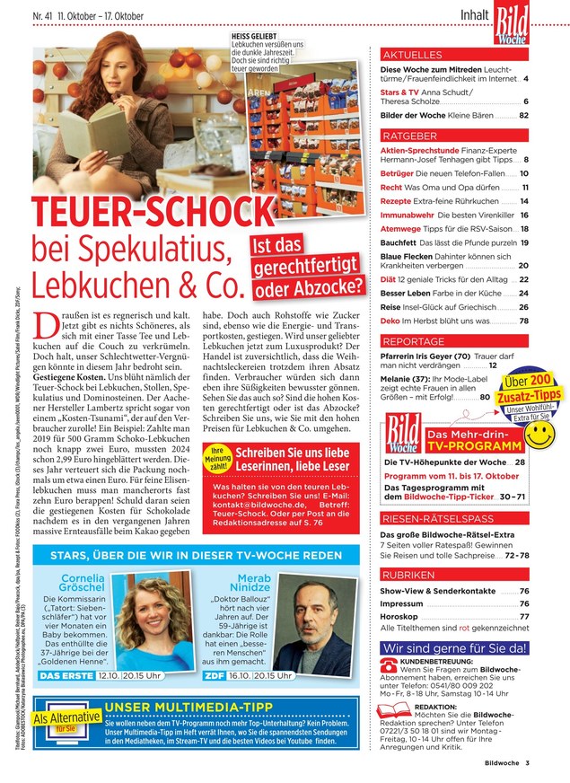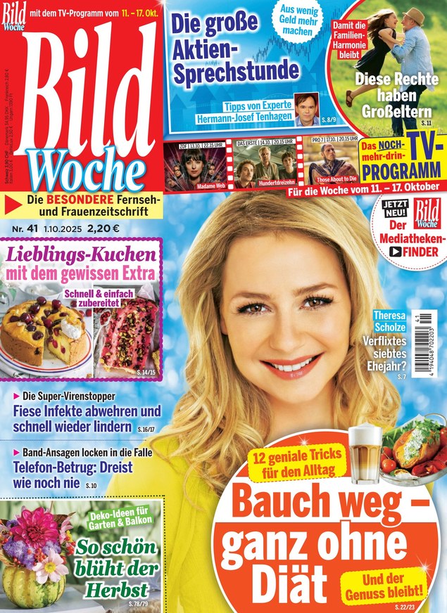 Im TV-Programm erweitert die Bild Woche ihre redaktionelle Leistung. Zusätzlich zum liebgewonnenen Programm präsentiert die Bild Woche an den sieben Tagen über 120 Tipps in einer besonderen Leiste. Doch diese sind keine klassischen Sendungshinweise, sondern spannende Hintergrund-Informationen zu den Stars, fundierte Service-Tipps als Ergänzung oder kleine Spaß-Elemente für die TV-Pause.