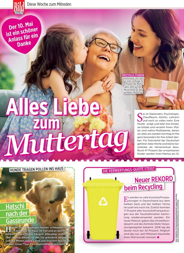 Dieser Claim steht für das neue Konzept der Bild Woche. Der Mantel garantiert zum einen hohen Nutzwert durch ausführliche Ratgeber mit Tipps und Informationen zu allen Bereichen des täglichen Lebens, zum anderen mitreißende Unterhaltung durch "Geschichten, die das Leben schreibt“, die auch immer mit einem Experten-Rat verbunden werden.