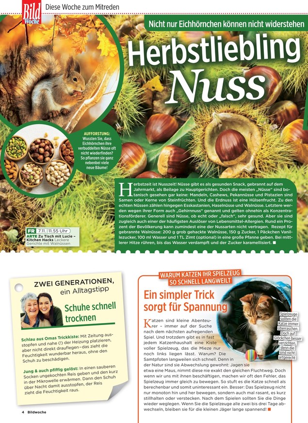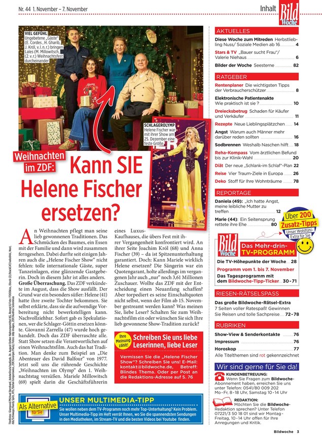 Im TV-Programm erweitert die Bild Woche ihre redaktionelle Leistung. Zusätzlich zum liebgewonnenen Programm präsentiert die Bild Woche an den sieben Tagen über 120 Tipps in einer besonderen Leiste. Doch diese sind keine klassischen Sendungshinweise, sondern spannende Hintergrund-Informationen zu den Stars, fundierte Service-Tipps als Ergänzung oder kleine Spaß-Elemente für die TV-Pause.