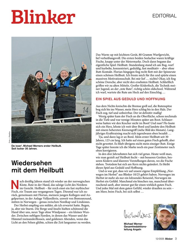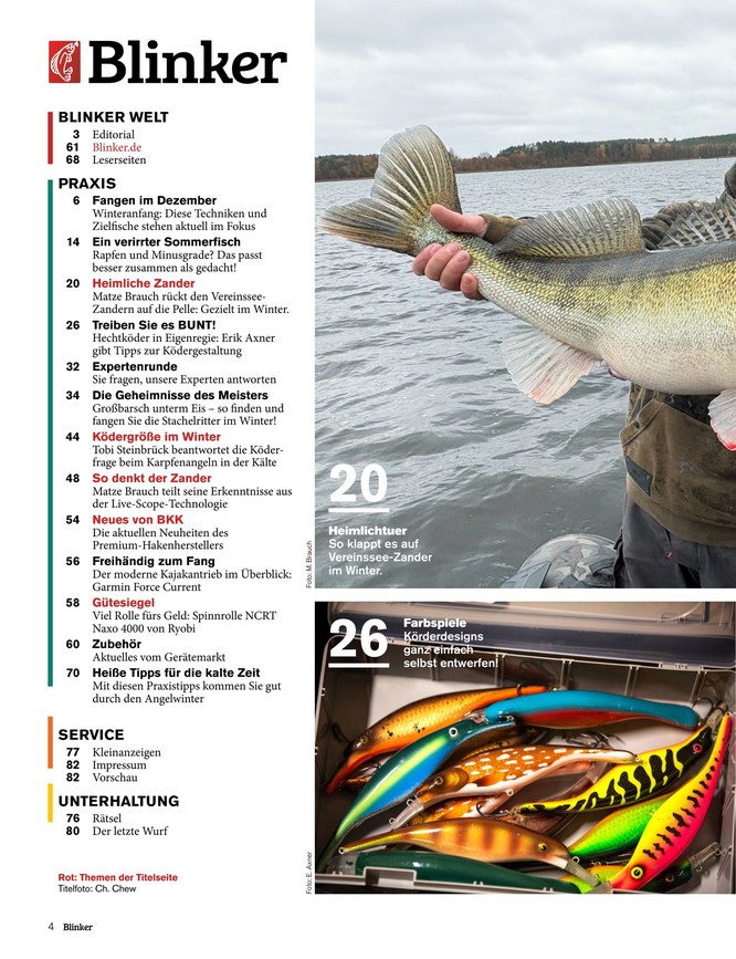 Mit der aktuellen Ausgabe der Zeitschrift Blinker erhalten Sie ein Fachmagazin, das regelmäßig über alle Aspekte des Angelns berichtet, angefangen beim Zubehör über Techniken bis hin zu Gewässern. Weiterlesen...