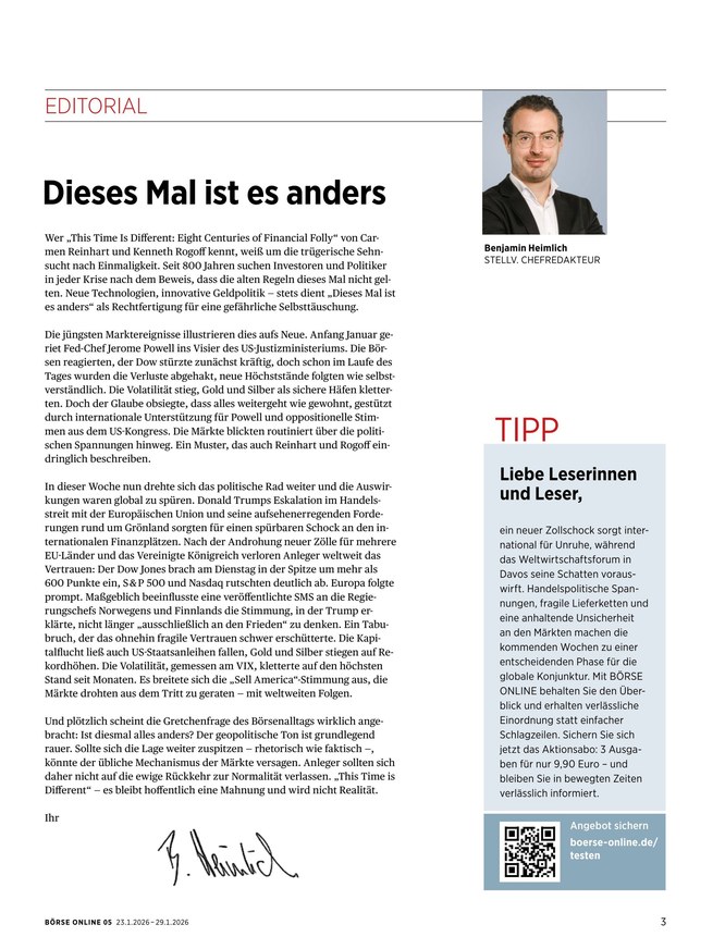 Das Fachmagazin BÖRSE ONLINE erscheint wöchentlich und liefert seinen Lesern konkrete und unabhängige Informationen rund um den Finanz- und Investmentmarkt. Weiterlesen...