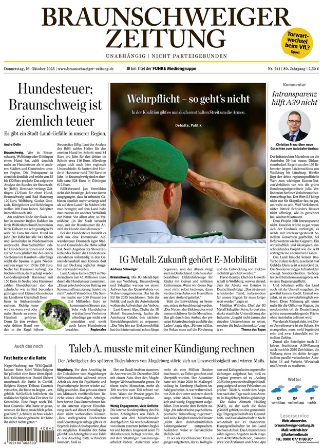 Die Braunschweiger Zeitung berichtet über Politik, Wirtschaft und aktuelle Nachrichten aus Braunschweig, Region und Niedersachen. Zusätzlich gibt es auch Informationen über die Themenfelder Sport, Boulevard und einen Ratgeber