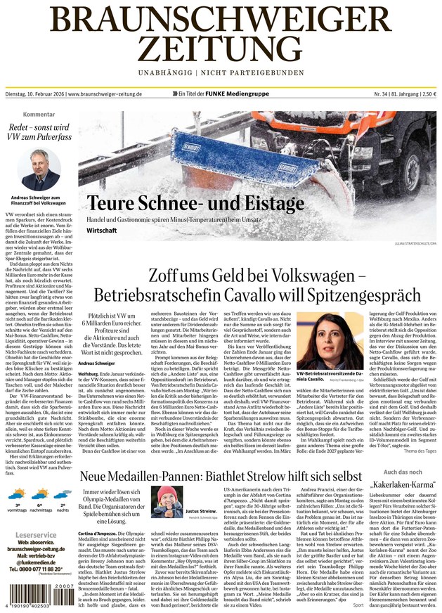 Die Braunschweiger Zeitung berichtet über Politik, Wirtschaft und aktuelle Nachrichten aus Braunschweig, Region und Niedersachen. Zusätzlich gibt es auch Informationen über die Themenfelder Sport, Boulevard und einen Ratgeber
