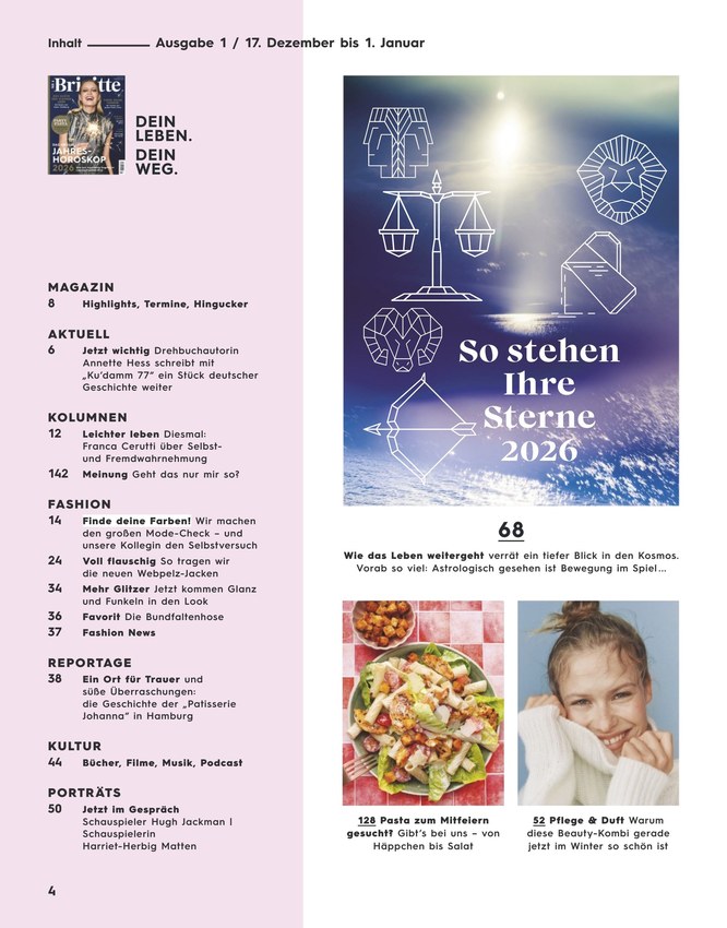 Die deutsche Frauenzeitschrift Brigitte erscheint im zweiwöchentlichen Rhythmus und beschäftigt sich mit Themen wie Mode und Kultur, Psychologie und Partnerschaft oder Umwelt und Beruf. Weiterlesen...
