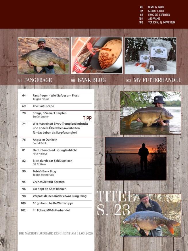 Sie sind Karpfenangler aus Leidenschaft und immer auf der Suche nach den besonderen Details, die den Erfolg beim Karpfenangeln ausmachen? Im zweimonatigen Rhythmus versorgt Sie das ePaper des CarpMirror mit allem, was Sie zum Thema Karpfenfischen wissen müssen. Die digitale Ausgabe können Sie ganz bequem auf Ihrem Smartphone, Tablet, Laptop oder Computer lesen. Clever: So haben Sie auf das neueste Heft des CarpMirror bereits am Erscheinungstag Zugriff - und das nicht nur zuhause, sondern sogar direkt am Wasser!