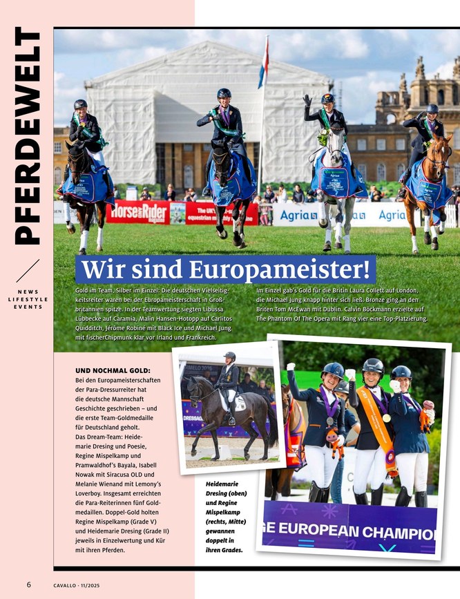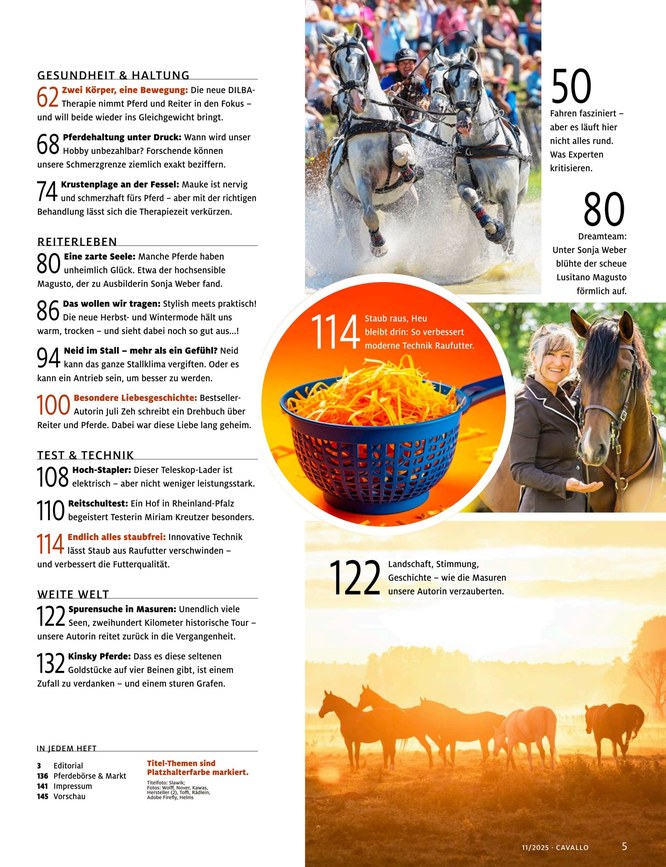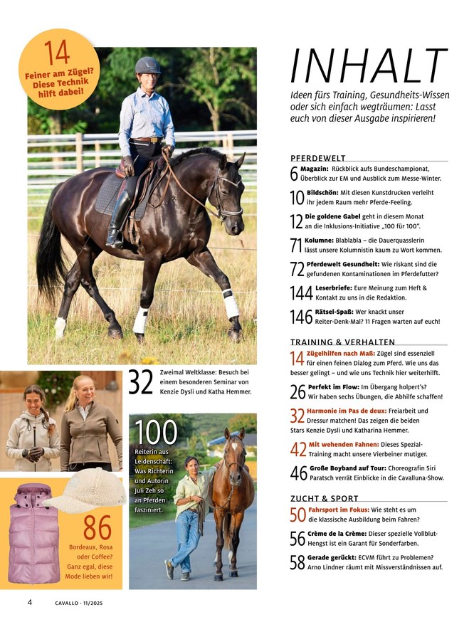 Der Untertitel des Magazins CAVALLO - "Weil wir Pferde lieben" - verrät schon, worauf sich der Leser im Inneren des Heftes freuen kann: Alle wichtigen Themen rund ums Pferd und den Reitsport. Folgerichtig gehört CAVALLO zu den angesehensten und erfolgreichsten Magazinen aus dem Pferdesport-Bereich. Die Redaktion ist bestens qualifiziert und berichtet voller Hingabe von verschiedenen relevanten Schauplätzen. CAVALLO selbst bezeichnet sich als "das innovative Magazin für aktive Reiter" - und lässt diesen Worten im Zeitschrift-Inneren stets Taten folgen.