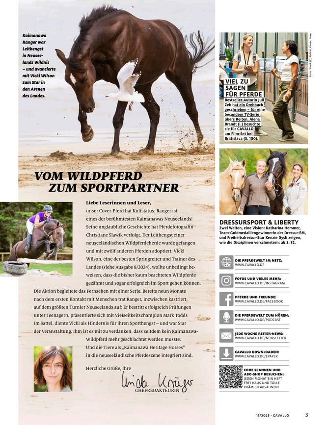 Die digitale Ausgabe von CAVALLO liefert Ihnen alles, was Sie an der gedruckten Ausgabe so schätzen und darüber hinaus vieles mehr! Das ePaper enthält dieselben Artikel und Bilder in identischer Aufmachung, bietet aber zusätzliche Funktionen: Sie können zoomen, Lesezeichen setzen und eine Suchfunktion nutzen. Ob Sie das ePaper zuhause am Computer oder unterwegs auf dem Tablet oder Smartphone lesen, bleibt Ihnen freigestellt. Im iKiosk ist neben der aktuellen Ausgabe der Zeitschrift auch der Zugriff auf bereits vergangene Ausgaben des Magazins möglich.