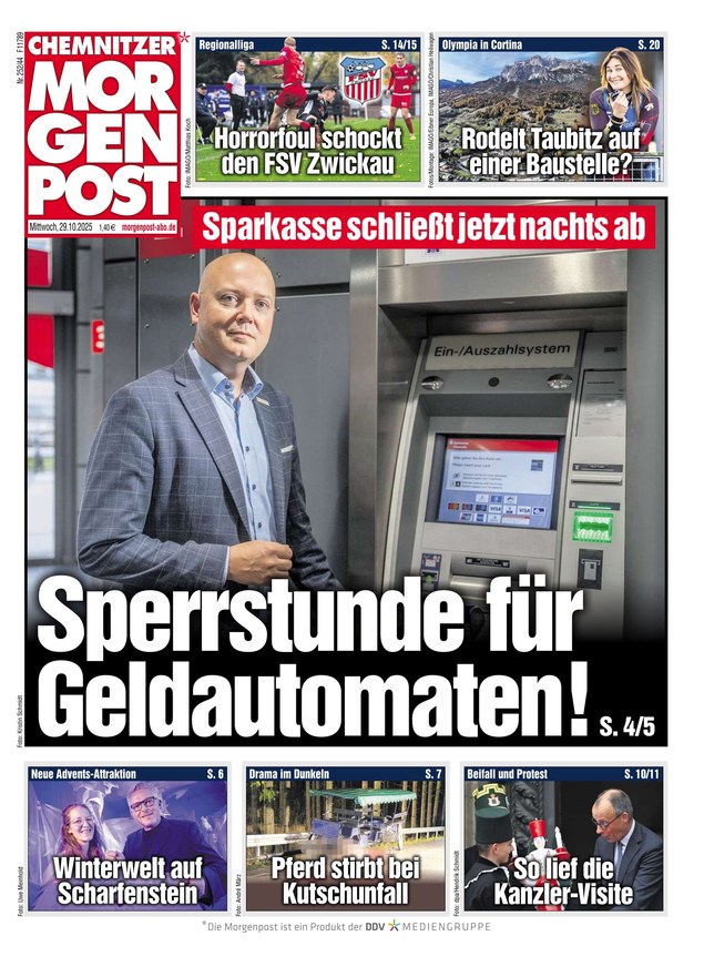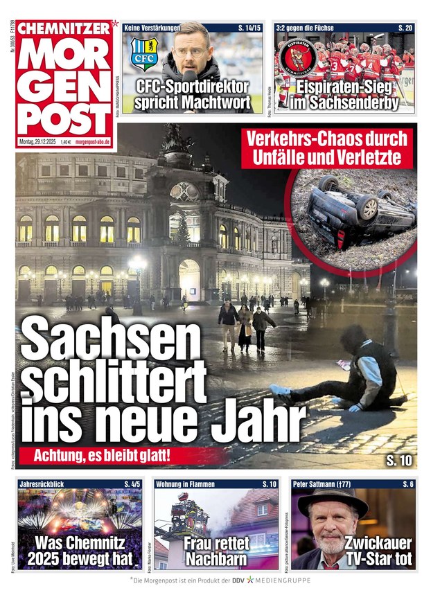 Alles, was in Chemnitz und Umgebung wichtig ist, steht täglich in der Chemnitzer Morgenpost. Die Tageszeitung erscheint Montag bis Samstag. Das ePaper wird - ebenso wie die gedruckte Ausgabe - auch weit über die Stadtgrenze hinaus gelesen.