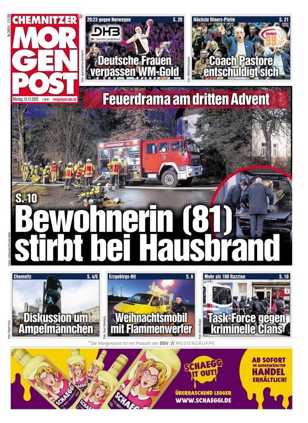 Alles, was in Chemnitz und Umgebung wichtig ist, steht täglich in der Chemnitzer Morgenpost. Die Tageszeitung erscheint Montag bis Samstag. Das ePaper wird - ebenso wie die gedruckte Ausgabe - auch weit über die Stadtgrenze hinaus gelesen.