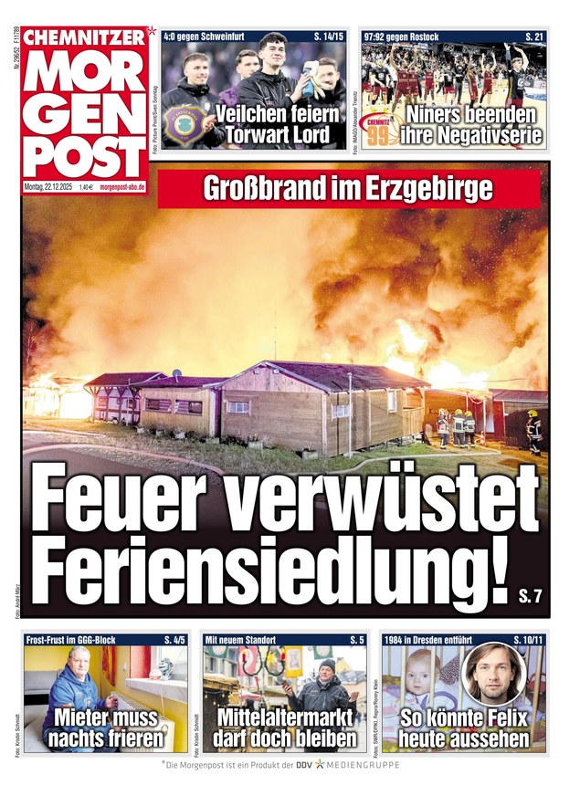 Alles, was in Chemnitz und Umgebung wichtig ist, steht täglich in der Chemnitzer Morgenpost. Die Tageszeitung erscheint Montag bis Samstag. Das ePaper wird - ebenso wie die gedruckte Ausgabe - auch weit über die Stadtgrenze hinaus gelesen.
