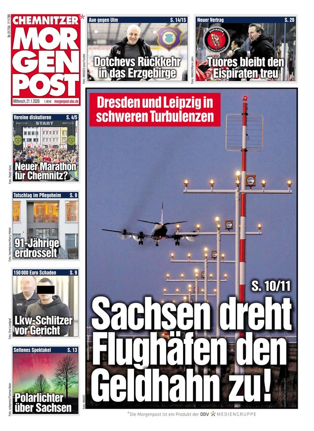 Alles, was in Chemnitz und Umgebung wichtig ist, steht täglich in der Chemnitzer Morgenpost. Die Tageszeitung erscheint Montag bis Samstag. Das ePaper wird - ebenso wie die gedruckte Ausgabe - auch weit über die Stadtgrenze hinaus gelesen.