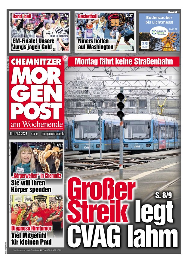 Alles, was in Chemnitz und Umgebung wichtig ist, steht täglich in der Chemnitzer Morgenpost. Die Tageszeitung erscheint Montag bis Samstag. Das ePaper wird - ebenso wie die gedruckte Ausgabe - auch weit über die Stadtgrenze hinaus gelesen.