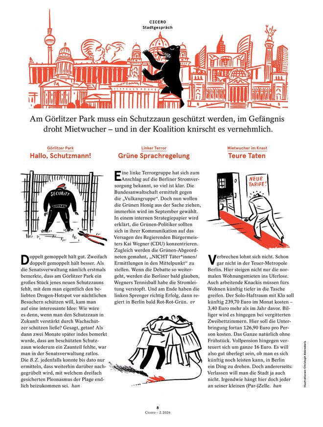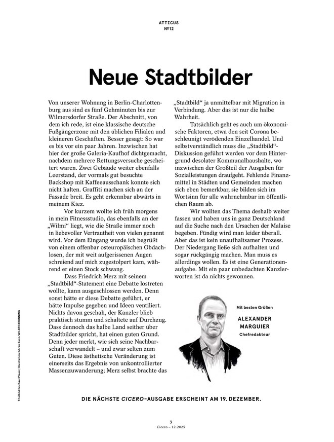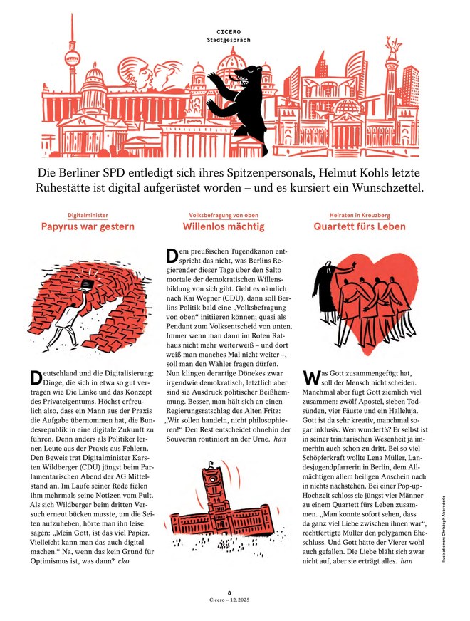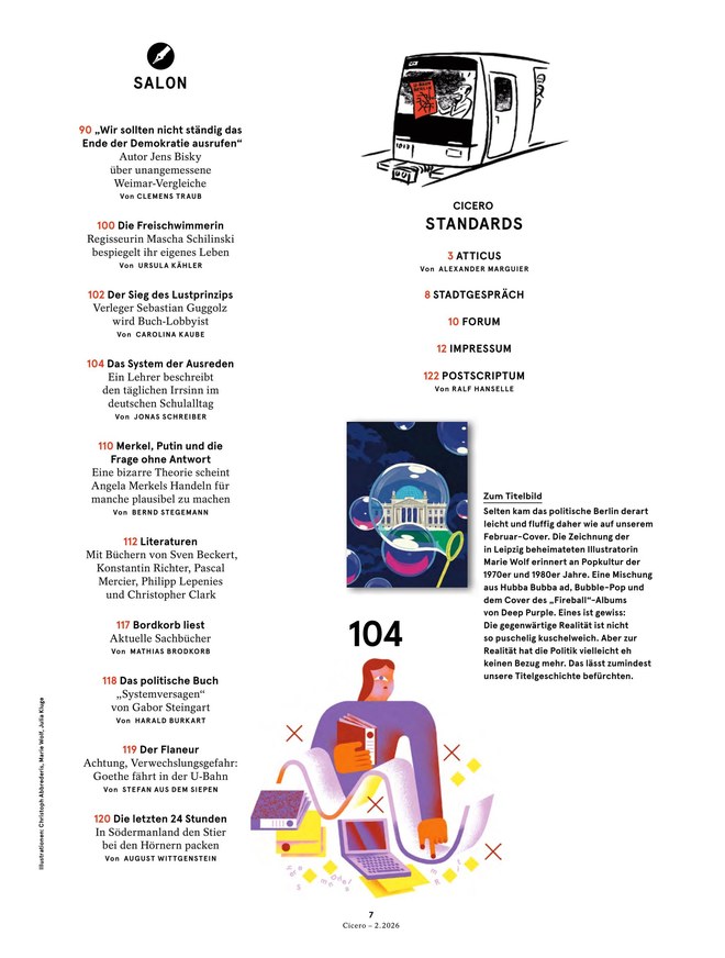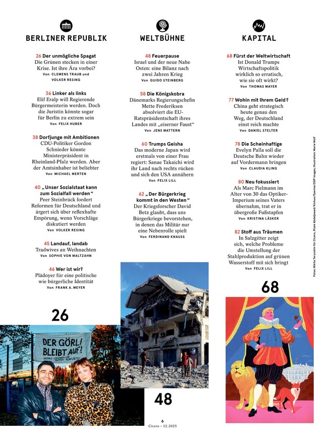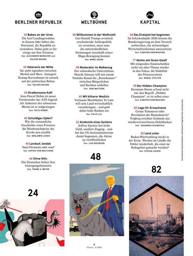Cicero bietet in jeder Ausgabe vier unterschiedliche Ressorts, die sowohl auf dem kunstvollen Cover als auch im Editorial vorgestellt werden. Darunter: